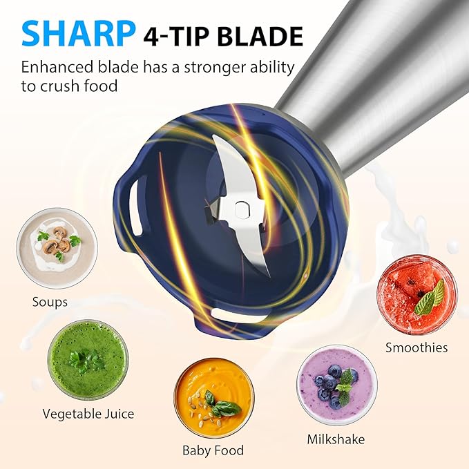 - 1000W Motor & 304 Stainless Steel 4-tip Blade: Compared with other 300-500W motors, upgraded KOIOS handheld blender is equipped with a 1000W all-copper motor, which is more powerful and has a stronger ability to crush food. With 304 food-grade stainless steel blades, this material has good oxidation resistance and high temperature resistance. Safe to use even in hot soup.