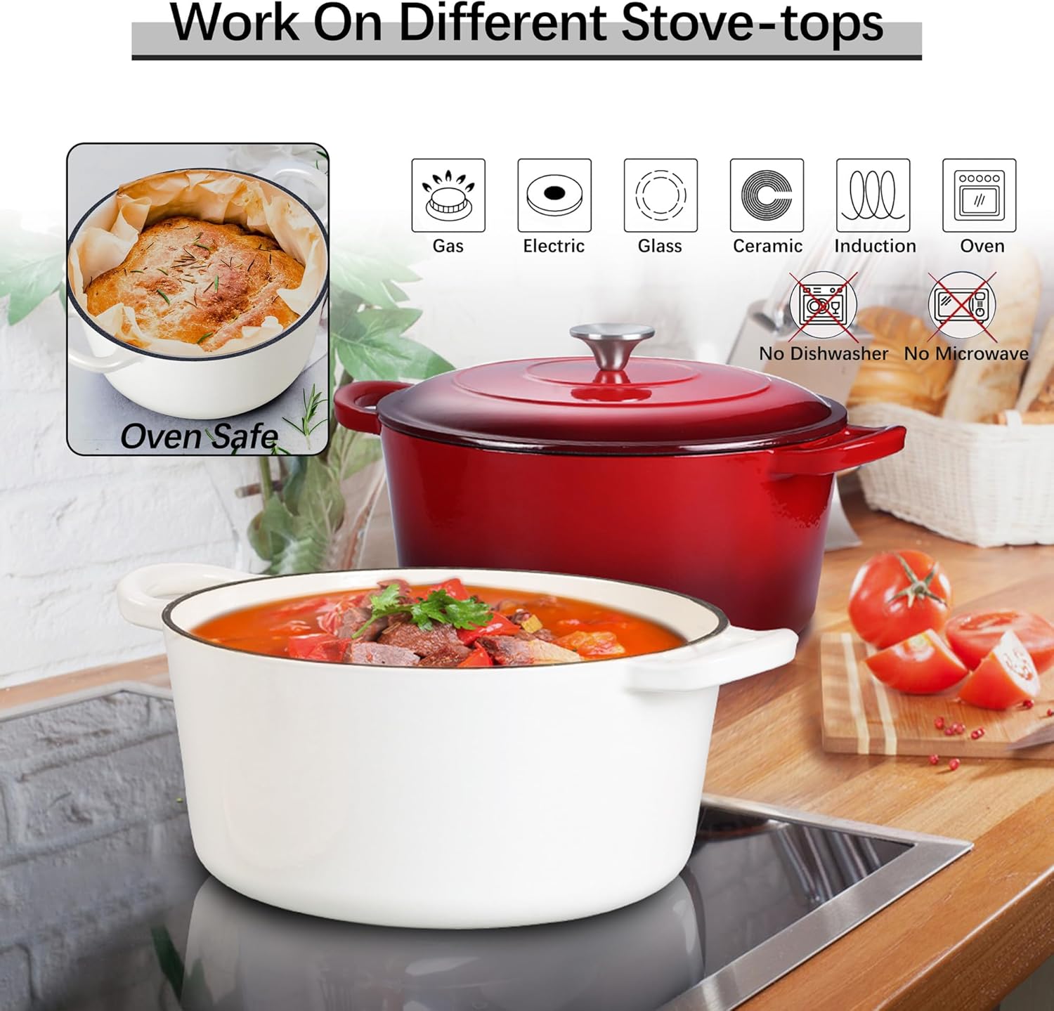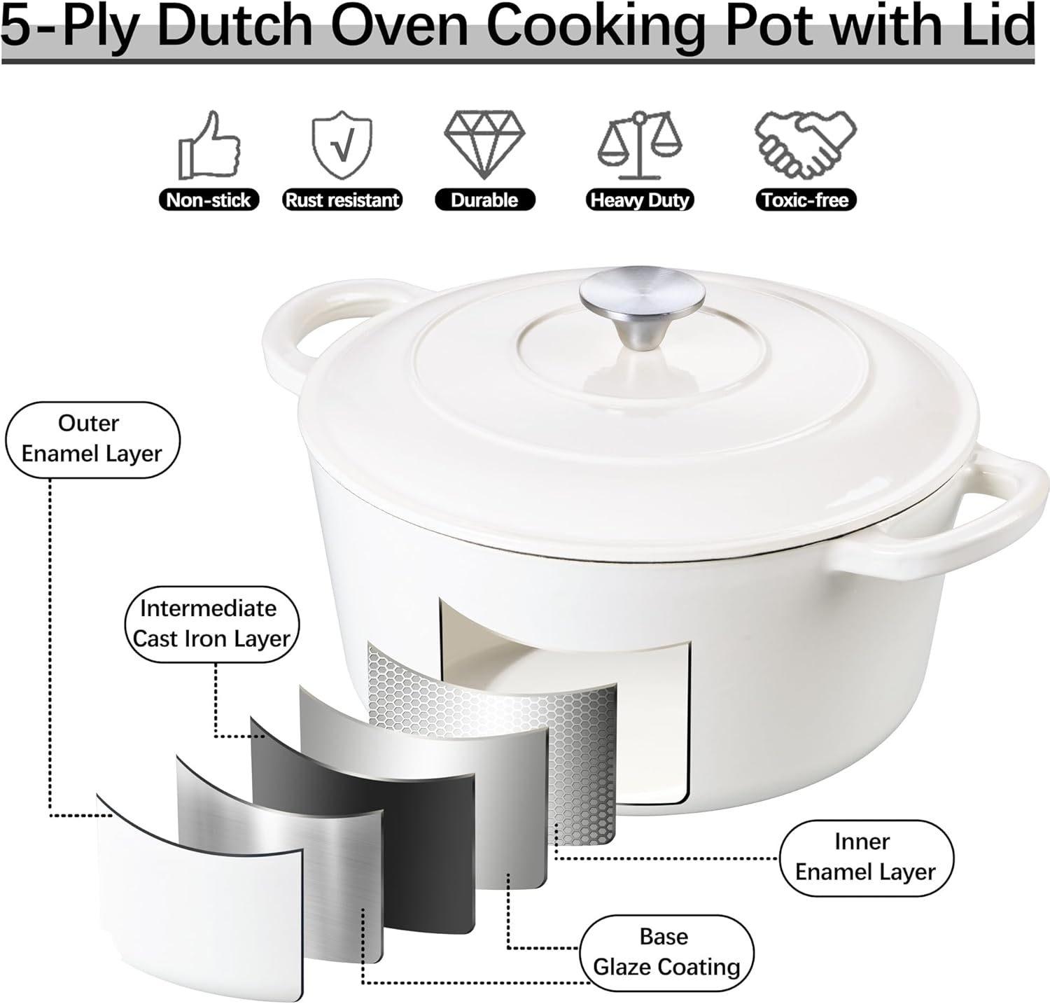 - ENAMELED CAST IRON DURABLE & EASY CLEAN: Our dutch oven pot is made of high quality cast iron core and food grade nontoxic & nonstick enameled coating, which win extra points compared to the traditional bare cast iron pot, Ours with double protection enameled layers coated both inside and outside can reduce the risk of being rusting and staining, Extend their serving life for years, The smooth enameled surface is impervious to water and other consumables, Ensuring less food sticking on the pot, You can easily mug the dirty(after soaking for a while) away by hands with a soft dishcloth, No longer suffer in cleaning