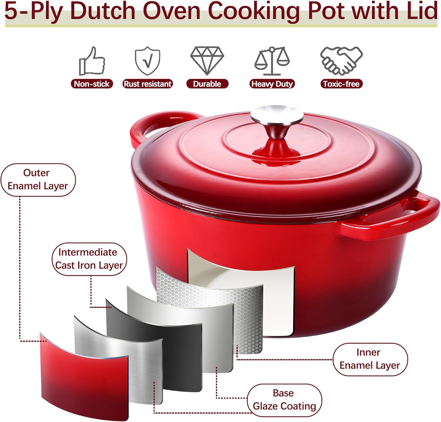 - ENAMELED CAST IRON DURABLE & EASY CLEAN: The cookware is made of high quality cast iron core and food grade nontoxic & nonstick enameled coating, which win extra points compared to the traditional bare cast iron pot, The dual enameled layers coated both inside and outside can reduce the risk of being rusting and staining, Extend their serving life for years, The smooth enameled surface is impervious to water and other consumables, Ensuring less food sticking on the pot, You can easily mug the dirty(after soaking for a while) away by hands with a soft dishcloth, No longer suffer in cleaning