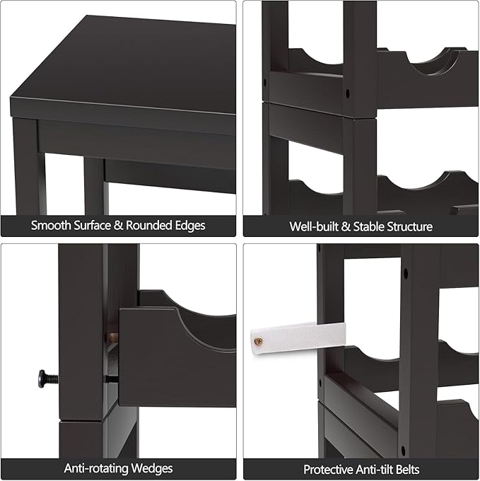 - STURDY CONSTRUCTION - Made of thickened bamboo, this wine rack is well built to prevent itself from deforming or wobbling. After multiple polishing processes and careful varnish treatment, its edges are rounded. its surface is smooth and moisture-proof.