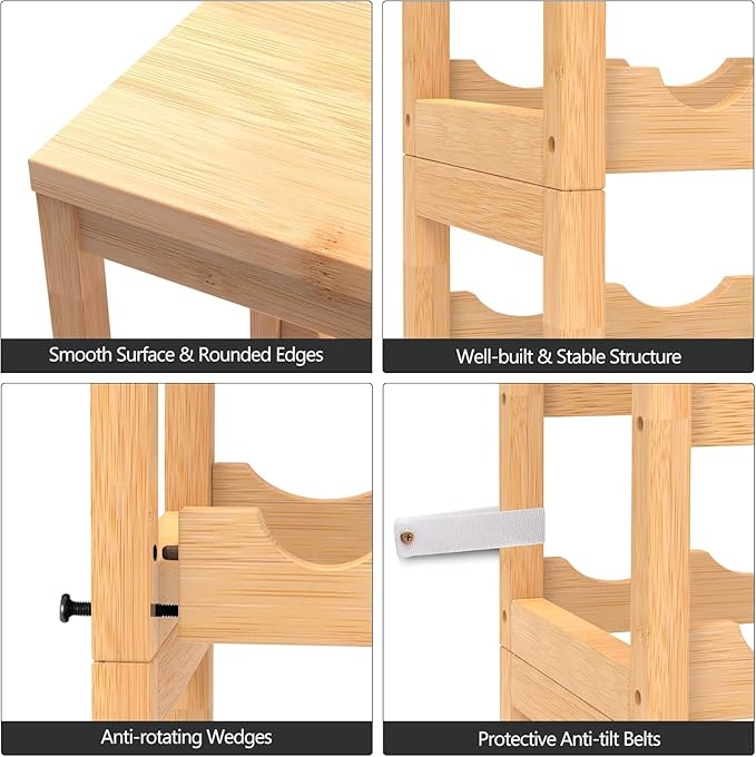 - STURDY CONSTRUCTION - Made of thickened bamboo, this wine rack is well built to prevent itself from deforming or wobbling. After multiple polishing processes and careful varnish treatment, its edges are rounded. its surface is smooth and moisture-proof.