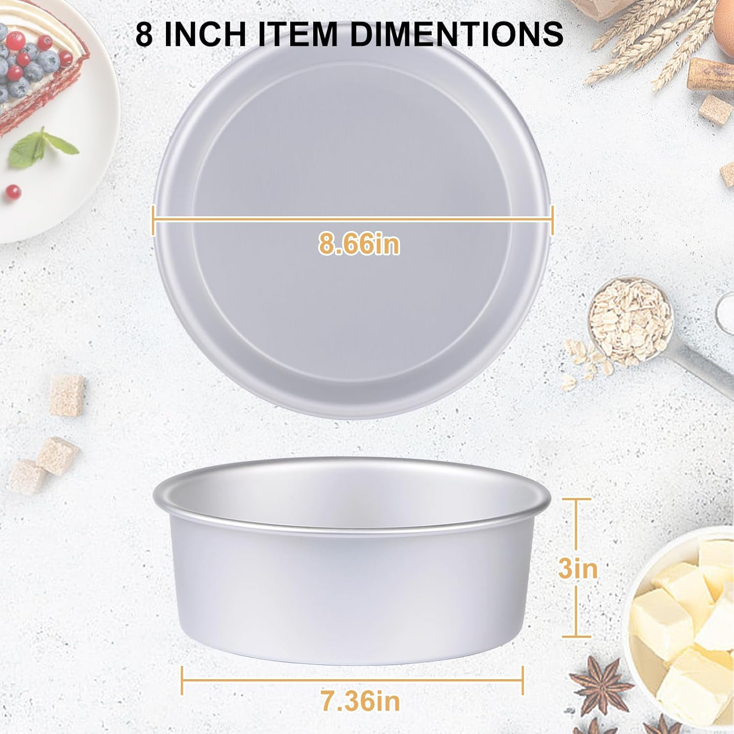 - 🎂【PREMIUM QUALITY & HEAT EVENLY】This round cake pan is made of high quality aluminum alloy which is sturdy and durable. Compared to stainless steel, aluminum alloy heats evenly and has no hot spots. Also, stainless steel may rust after long time use, but aluminum cake pans will not have such problems. Ideal for baking various beautiful cakes / cream brulee for any occasion.