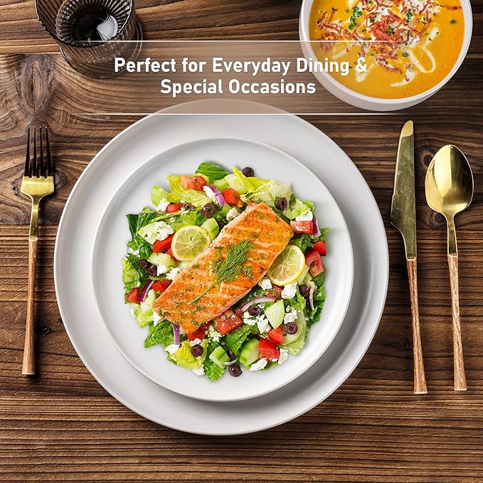 - 【Handcrafted Design and Reactive Glaze】Our dinnerware is designed by professional designers, with each plate handcrafted and adorned with a unique, classic reactive glaze. This set perfectly complements your home, adding a touch of elegance to your dining experience. The high rim design prevents sauces from spilling during summer meals. Additionally, the dinnerware is stackable, saving cabinet space, and is easy to clean for your convenience.