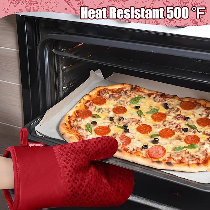 - Too Hot To Handle? Our cotton oven mitts have got you covered! Food-grade silicone, BPA free, and anti-slip silicone strips that can be held securely when handling the kitchen utensils.oven gloves are made of insulated, heat resistant cotton, offer excellent comfort while cooking and baking。Kitchen mittens comes with a hanging loop for convenient storage. The mitts are generously sized, comfortable to wear, and heat-resistant up to 500 F