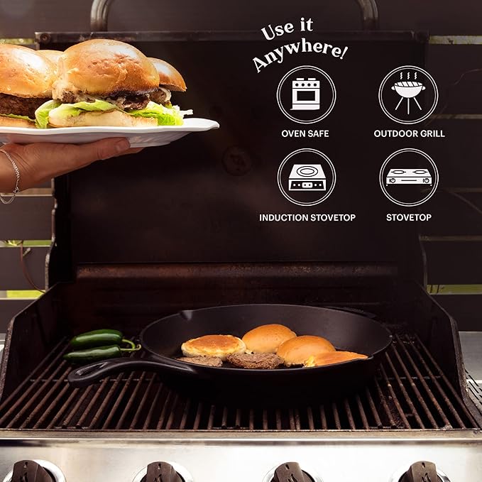 - PRECISION HEAT DISTRIBUTION – This cast iron skillet has a smooth finish to help provide even heat distribution for improved cooking and frying, even on grills, stoves or induction cooktops.