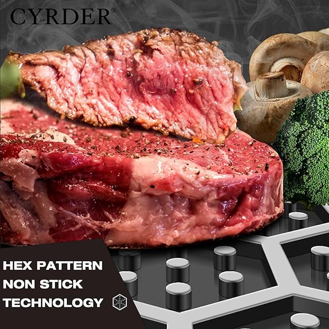 - Hybrid Laser-Etched Frying Pan – with the Brand New Hex construction Laser-Etched process, it is covered both inner and outer pan surface. The dual laser-etched surface makes great helpful in cooking, which is non stick while searing with less oil and butter.