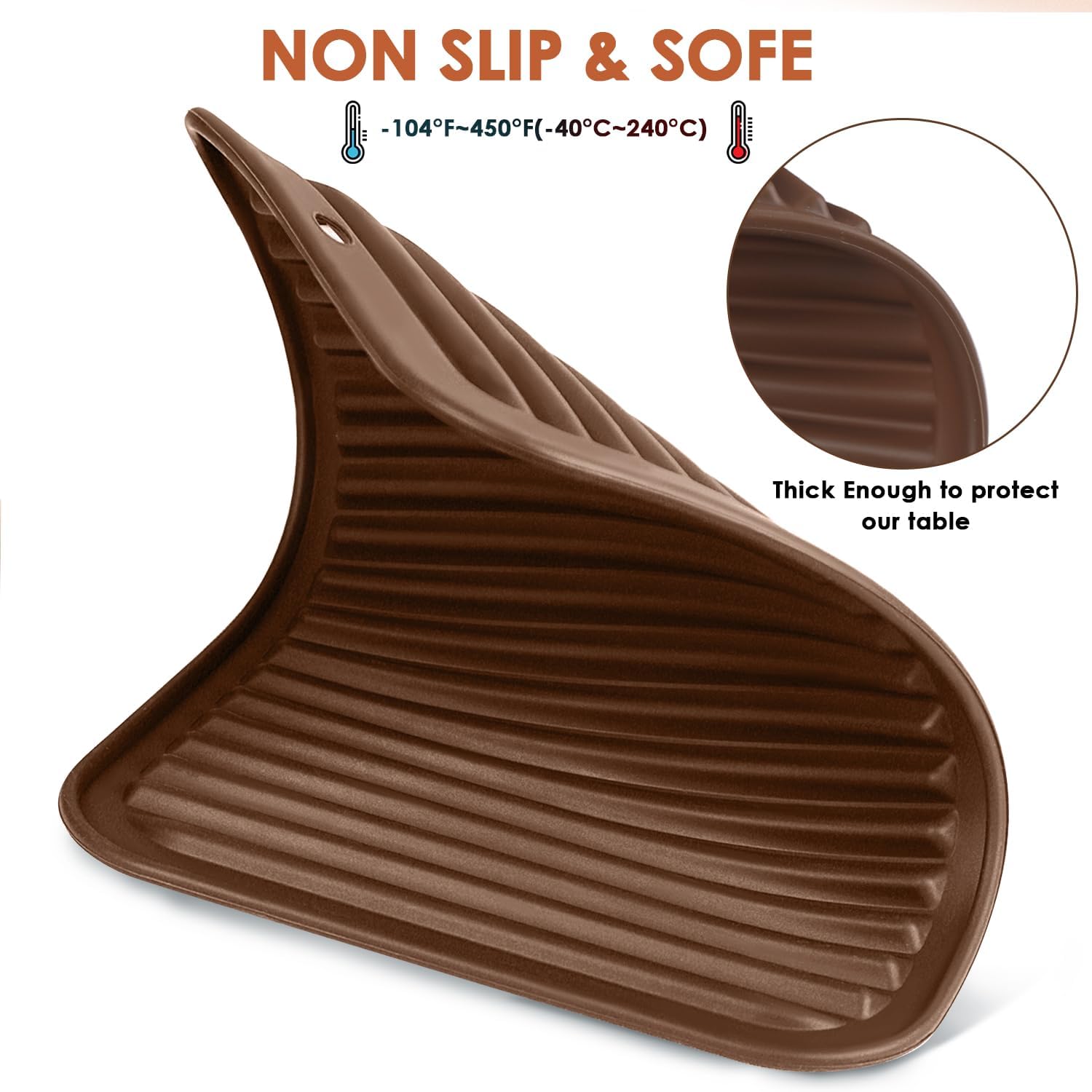 - 🍳【Smart Design】Our brown large cooking trivet pads frequently used in the kitchen, works as intended for what you need. The nonslip silicone hot pad with a wavy stripe design to catch sauce spills, oil splashes, effectively reduce kitchen accidents, keep countertops drying. The large silicon heat resistant mats great for countertops, also are practical gifts to your family or friends.
