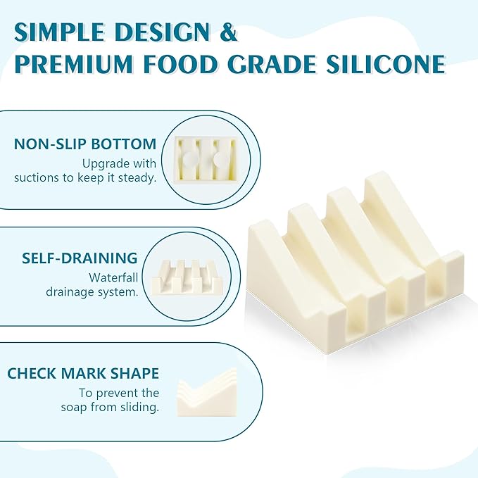 - Premium Silicone Construction: Our silicone soap dishes are made from high-quality, flexible silicone, ensuring durability and long-lasting use.