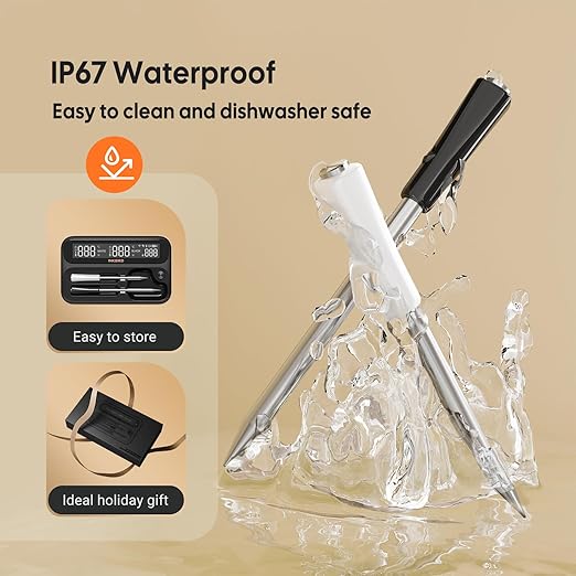 - IP67 WATERPROOF EASY FOR Clean AND STORAGE: The DUAL grill meat thermometer probes are IP67 waterproof and food-grade stainless steel and with zirconia unglazed ceramic handles, heat-resistant, and wear-resistant, easy to be cleaned in a dishwasher.The case can be storaged the probes neat and tidy