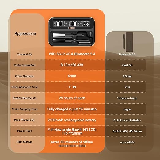 5GHz & 2.4GHz WiFi Wireless Meat Thermometer, INKBIRD WiFi Smart Thermometer with 2 Size-Coded Probes and Unlimited Range,Bluetooth 5.4 Thermometer with 360° Readable LCD-Enhanced Booster