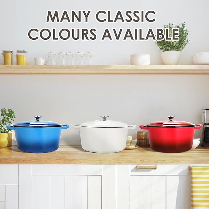 - CLASSIC DESIGN- Enameled cast iron dutch oven is designed with wide and sturdy dual handles which will not easily slip from your hands when you are holding it, decreasing potential danger. Additionally, we offer 3 classic colors-red, blue and white to choose which enables you to match it with your kitchen in any way you want.