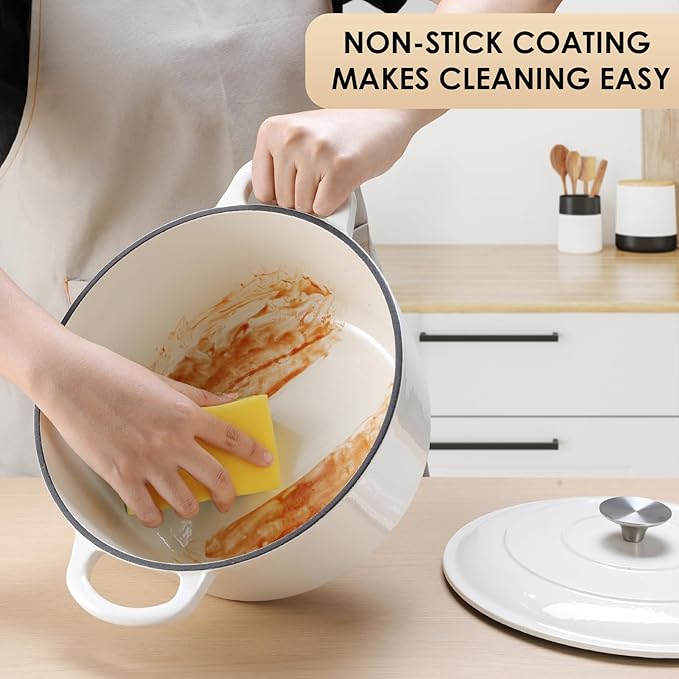 - EASY CLEANING- The enameled interior of cast iron dutch oven offers a smooth and non-stick surface which makes cleaning an effortless job. After each use, hand wash with warm water and a soft sponge cooperating with mild detergent is recommended to easily remove food residues and keep your oven clean as fresh.