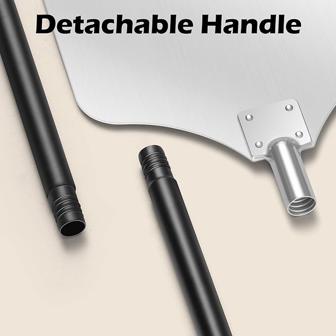 - Detachable Handle: the iron handle is detachable in two parts, short-handled pizza spatula longed 32.6inch, long-handled one can extend all the way to 48.7”, prevents your hands from getting burned. The peel can handle both home pizza ovens and commercial sized ovens