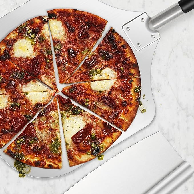 - Lightweight & User-Friendly, measuring 12inches wide, our pizza peel is constructed from lightweight material, ensuring durability without compromising food safety. Easily handle and use it by sprinkling a bit of corn flour for a non-stick surface, effortlessly sliding your pizza onto your plate