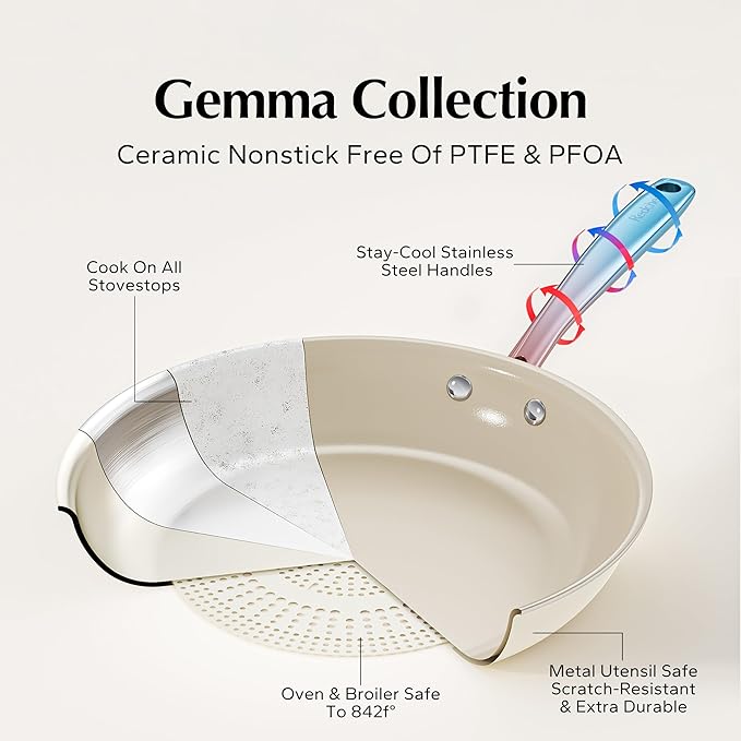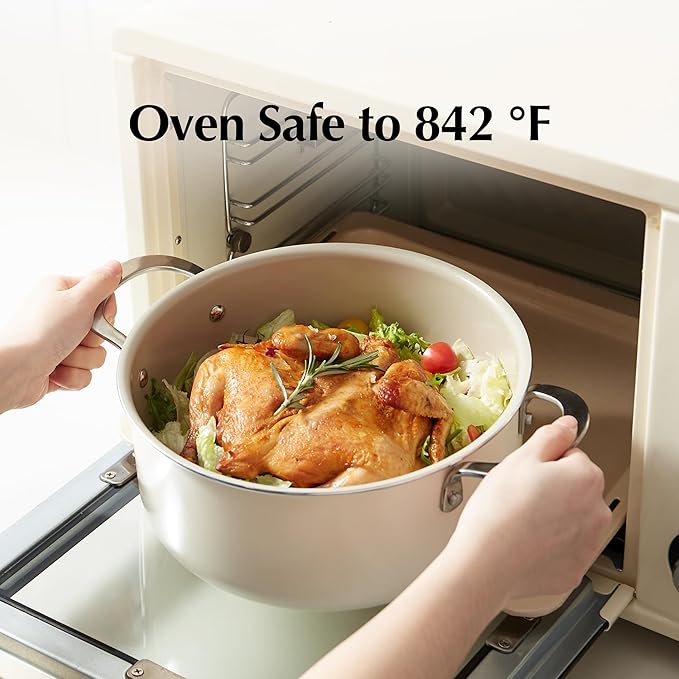 - Healthy Ceramic Coating: Redchef kitchen ceramic cookware set features a natural ceramic coating free from Teflon, PFAS, PTFE, PFOA, lead, and cadmium, ensuring safety and health. You can enjoy your cooking on cookware safely & easily