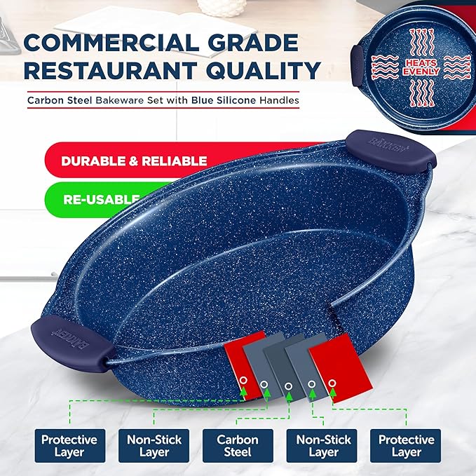 - DURABLE CONSTRUCTION: Made with commercial-grade carbon steel, this 10-piece bakeware set ensures even heat distribution for perfect baking without warping. The nonstick blue marble coating makes food easy to release and cleanup a breeze.
