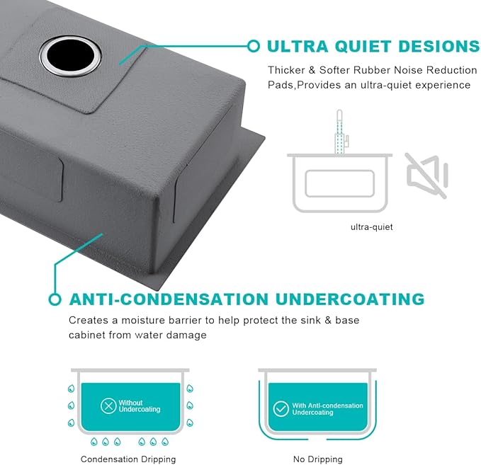 - 【Sound and Condensation Damping Design】This drop-in kitchen sink is equipped with extra-thick rubber dampening pads to minimize noise and vibrations. Its heavy-duty guard undercoating prevents condensation, safeguarding your cabinets and providing a quieter, more comfortable kitchen experience
