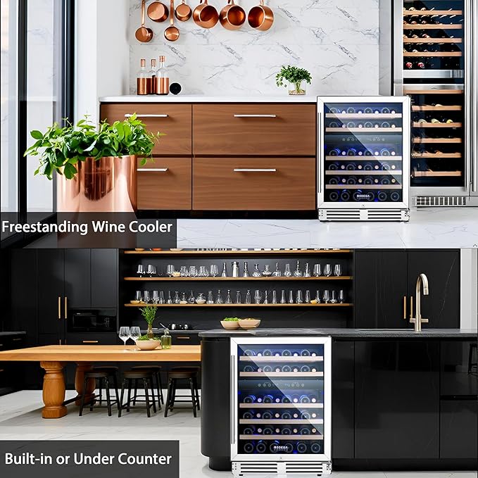 - 🍷46 Bottle Large Capacity: BODEGA 24 inch wine fridge dual zone holds up to 46 bottles of your favorite wine in different sizes, and is only affected when having larger bottle, like Pinot or Champagne. It is equipped with 5 removable and detachable beech wood shelves, making it easy to store bottles of different shapes and sizes. This mini wine beverage cooler could hold the drink you like too. You would not just enjoy your wine, could enjoy your drink too.
