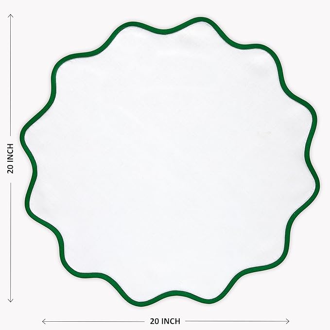 Solino Home Linen Napkins Set of 4-100% Pure Linen Garden Green and White Dinner Napkins Cloth 20 Inch for Thanksgiving, Christmas, Winter - Giselle Scallop Edge, Handcrafted and Machine Washable