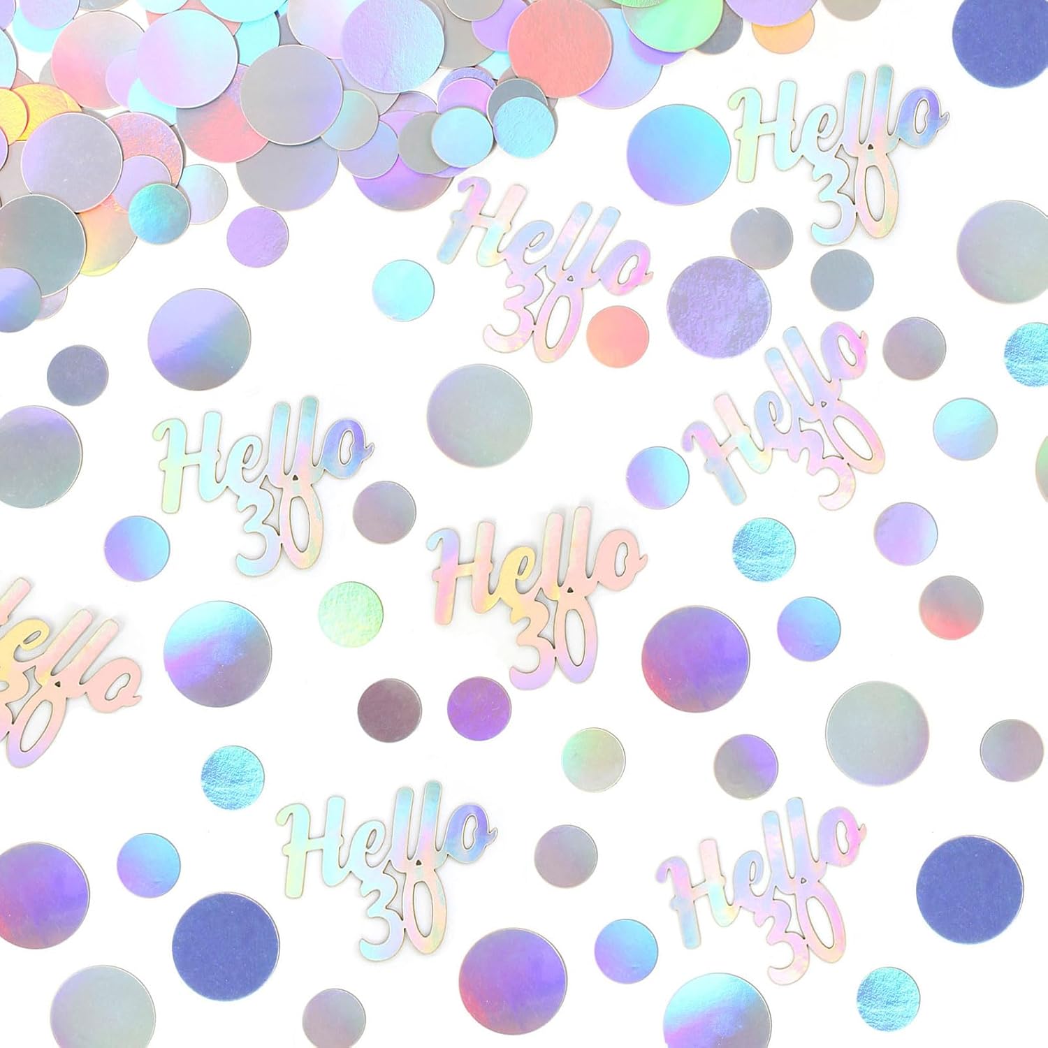 - Premium material, proper size and charming color.The cute biodegradable paper confetti is made from double sided silver foil paper card and well cut,the color is super amazing,looks like silver,but also like lots of pastel colors changing under the light. There is two sizes circles mix(1inch and 0.6inch),โHello 30โ letter confetti(1.7*1.3inch) ,recommend as table decorations or diy craft supply.