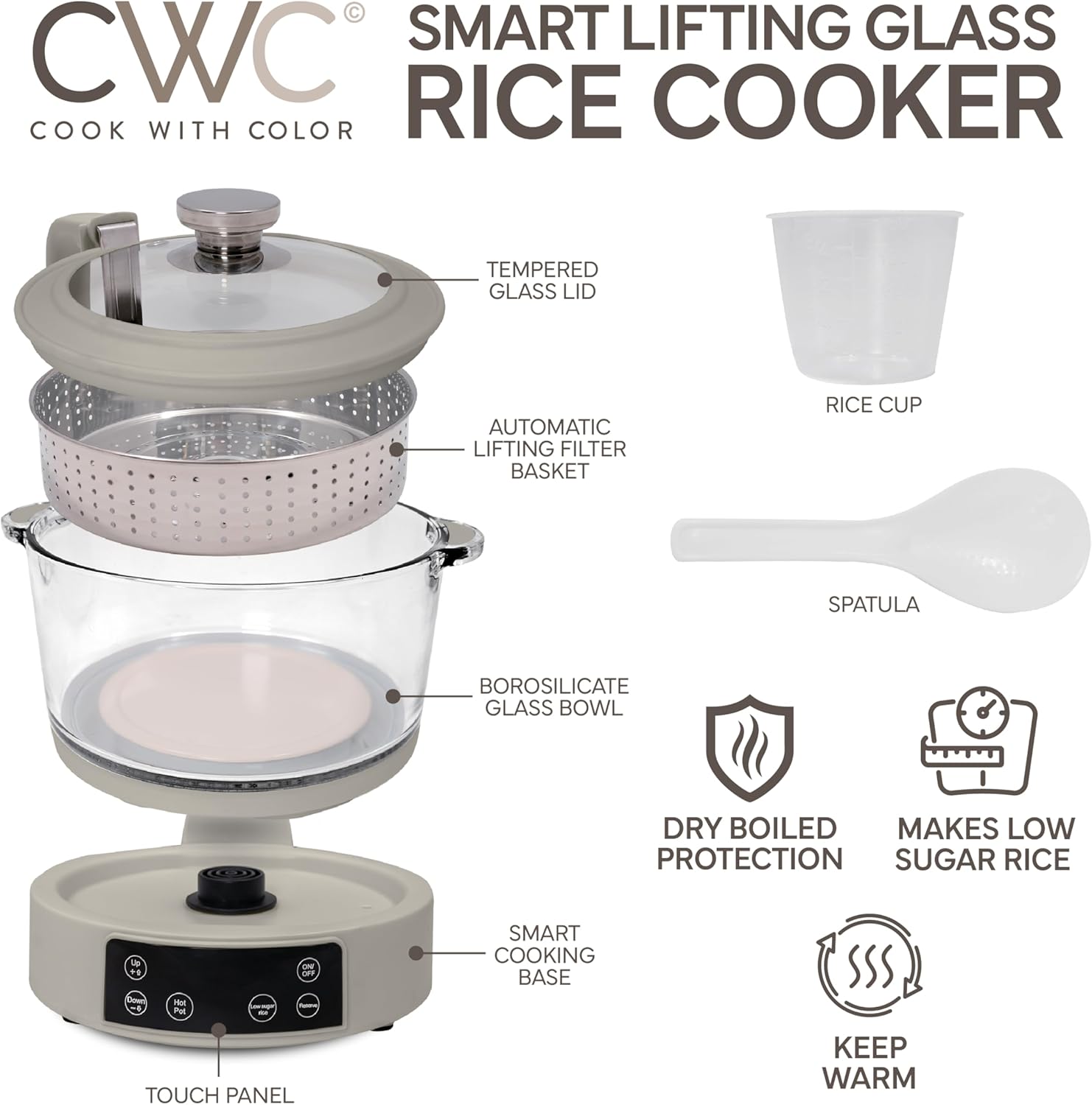COOK WITH COLOR 3L Glass Low Carb Rice Cooker - Makes 6 Cups Low Sugar Rice with Auto Lift Filter Basket, Hotpot & Steamer for Rice, Grains and Oats, Digital Panel with Keep Warm Function, Sand