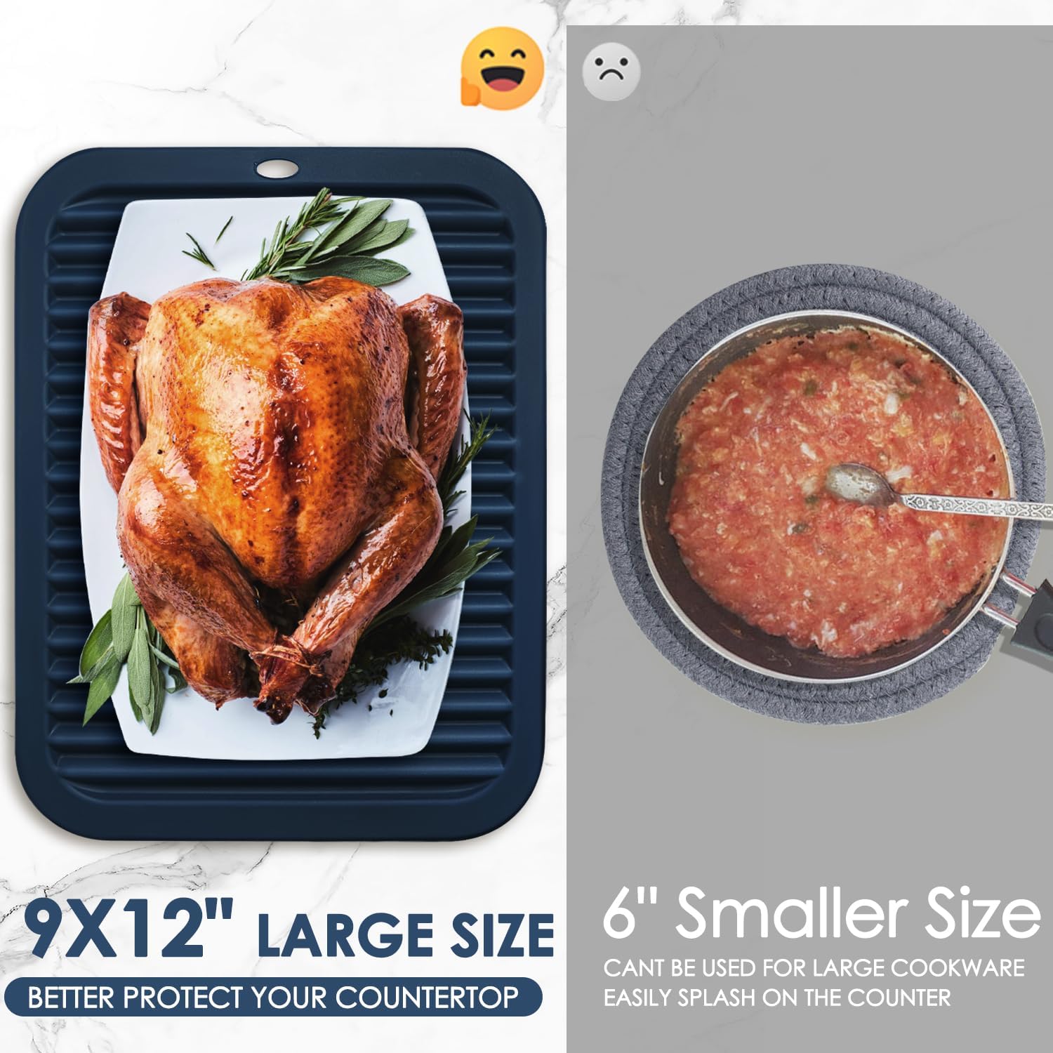 - 🥘Large Size of Rectangular Trivets: Our navy blue large silicone trivet with 9x11.6 Inches, leak-proof, nonstick, and lightweight, use the blue kitchen drying mat to replace old placemats, bulky oven mitts, or place pads under toasters or air fryers.