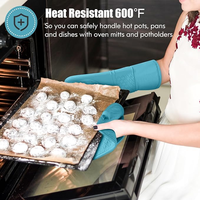 - Heat Resistant & Premium Material:The oven mitts and pot holders set consist of 2 layers of different material.The first layer is made of non-slip silicone and the oven mitt is heat resistant 600°F (315°C).The second layer of cotton is quilted to provide double protection