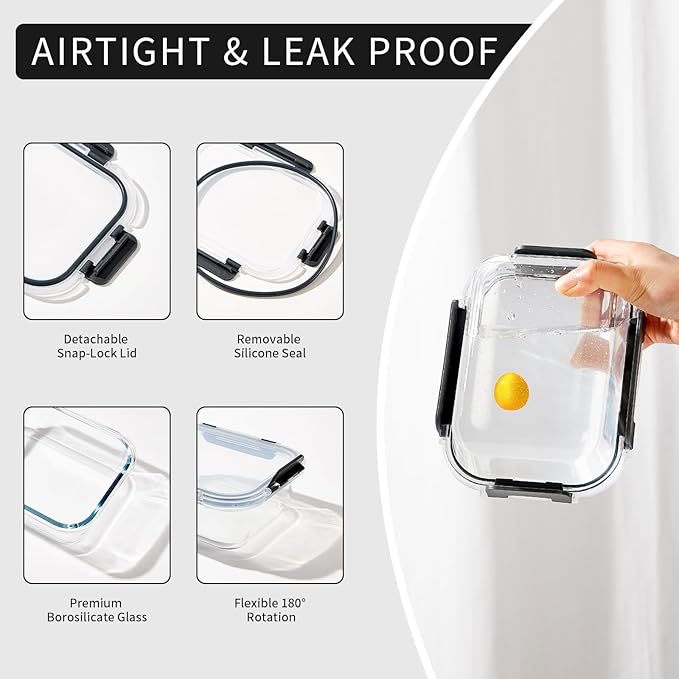 - Airtight Locking Lids: These glass food containers feature removable silicone seals and 4-hinge snap locks to prevent leaks, ensuring your food stays fresh; The lids are easy to open and close; Remember to remove the lid before heating or washing