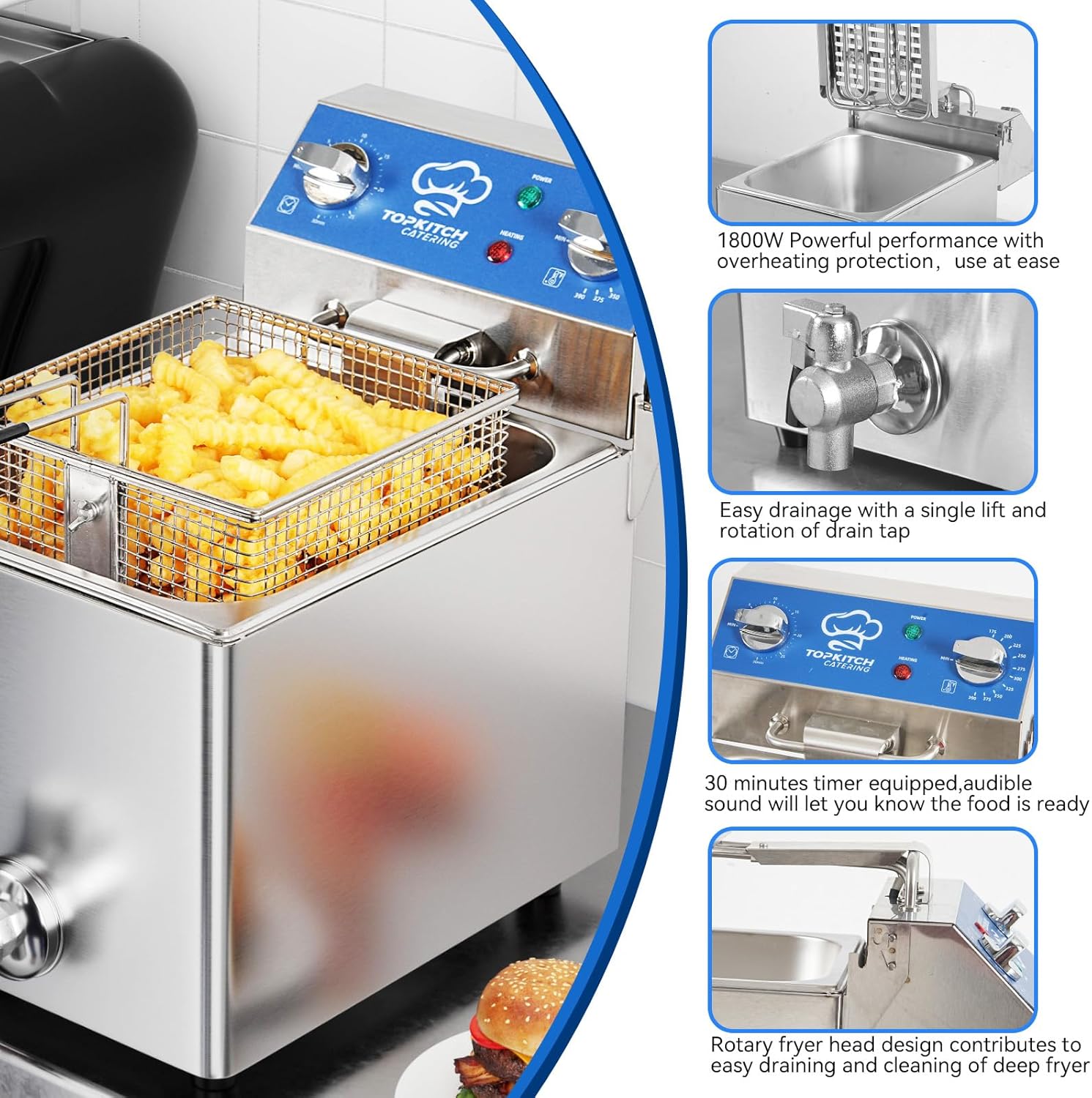- Easy Clean:Unique fryer head swing up function and copper draining valve contributes to no-hassle cleaning.