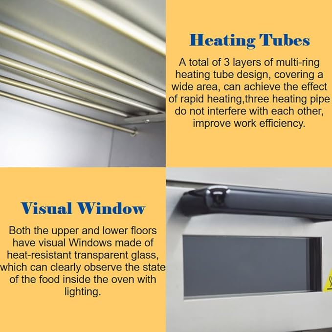 - Carefully Designed: The commercial pizza oven has a high-quality plastic insulated handle, which has good insulation effect and comfortable grip. Visual glass windows and explosion-proof floodlights help users observe the baking process.