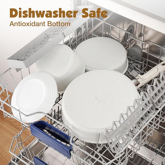 - Dishwasher Safe - Cleaning is a breeze. Professional wear-resistant design for the bottom of the pan set that prevents black residue even when used in the dishwasher.