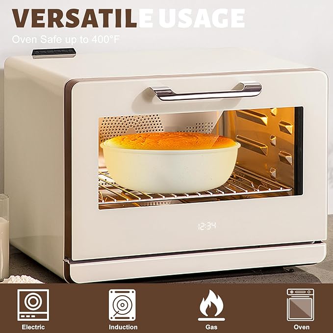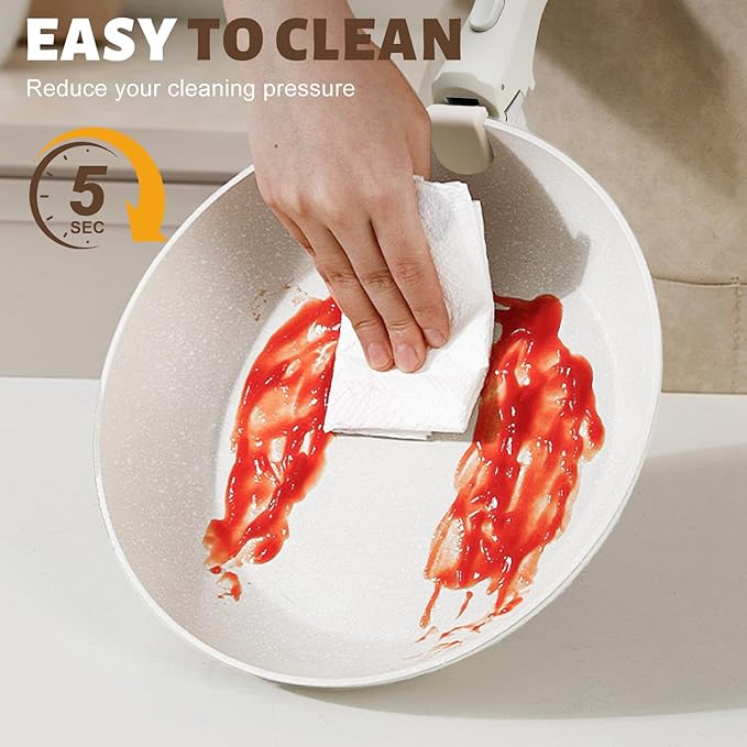 - Easy Cleaning: Clean your cookware set with mild detergent, warm water and a soft sponge or cloth to easily remove any residue with a simple rinse or quick wipe, ensuring your cookware is spotless and easy to keep in its pristine condition