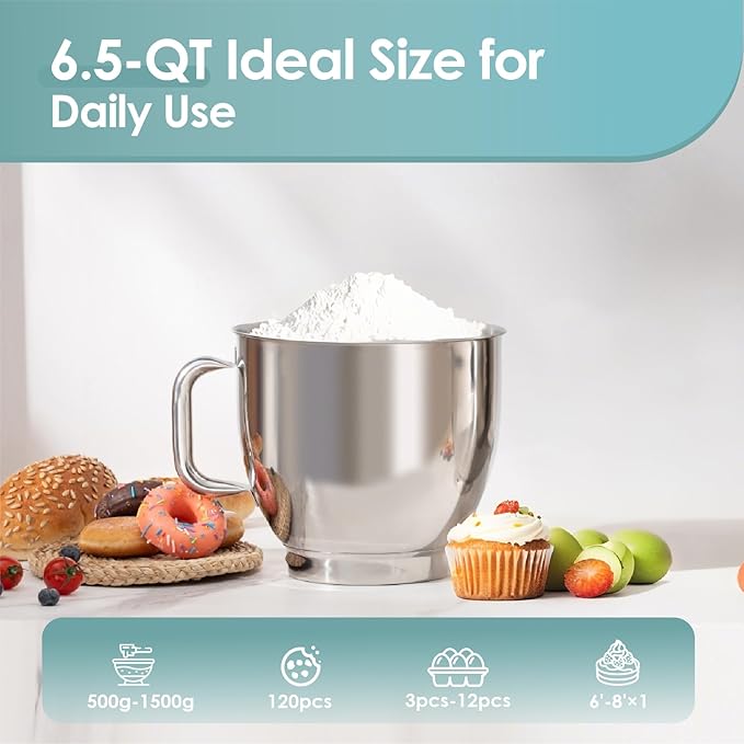 - Large Capacity 6.5 QT Stainless Steel Bowl - Our Household Stand Mixer ideal for family gatherings or hosting friends, meet needs of 2 - 6 people. Ideal for everyday baking, the kitchen mixer making it a reliable choice for making everything from bread dough to cake batter. Easy clean by Dishwasher.