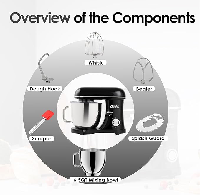 Kitchen in the box Stand Mixer - 6.5 Quart Mixing Bowl with Handle, 900 Watt Heavy Bread Dough Standing Mixers Tilt-head with Dough Hook, Whisk, Flat Beater and Splash Guard (Black)