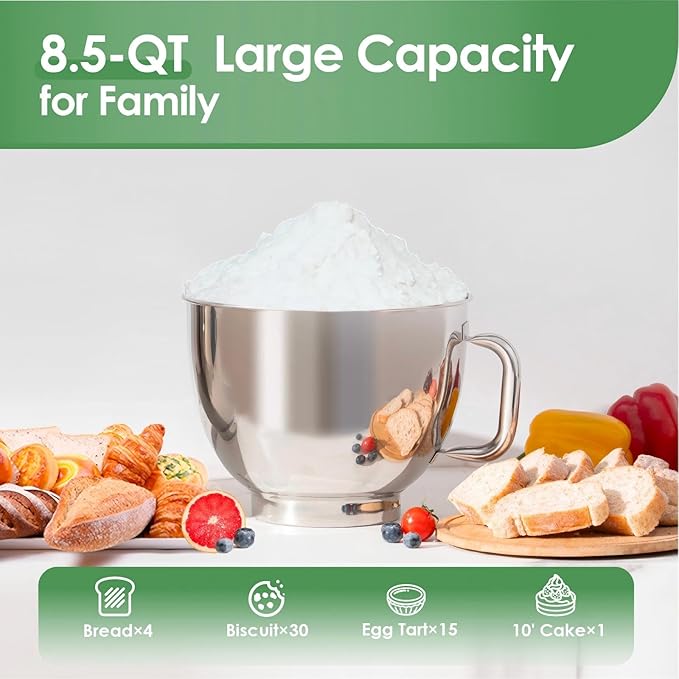- 8.5 Quart Giant Capacity: Our stand mixer comes with an 8.5 QT stainless steel bowl, providing ample space for preparing large batches of dough, batter, or mixtures. It's ideal for family meals, gatherings, and large-scale baking projects. The convenient single-handle design allows for easy lifting and pouring with hands.