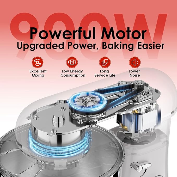 - 900W Powerful Motor: Equipped with a 900W pure copper motor, this mixer delivers robust power with smooth and efficient performance.The high-powered motor effortlessly handles heavy dough and thick mixtures while also providing precision whipping for delicate textures and consistent blending. Whether for daily use or complex baking needs, it delivers ideal results.