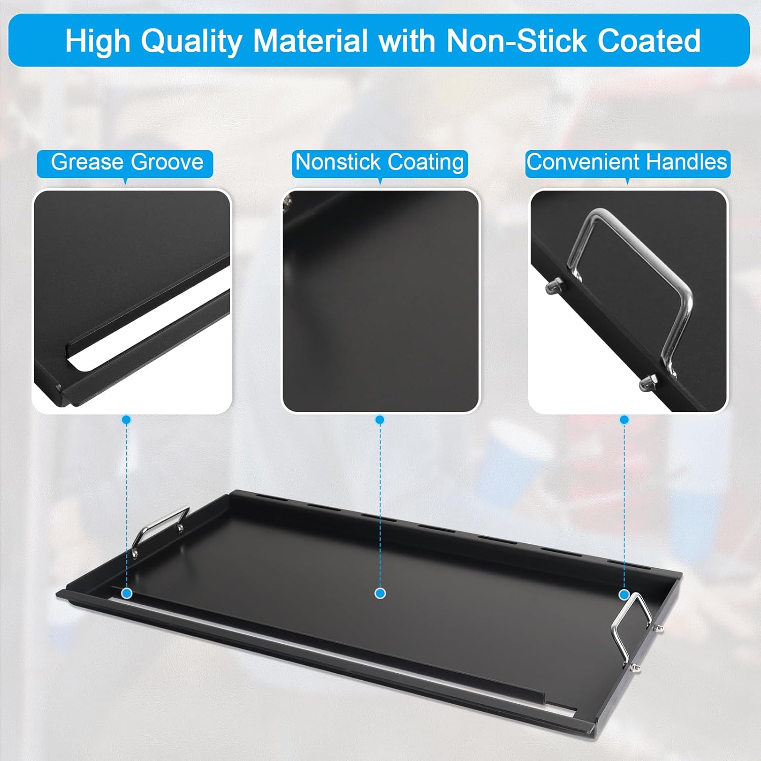 - Practical Flat Top Griddle: The grill griddle inserts comes with removable handles and heat-resistant gloves so you can pick it up and hold it safely and comfortably. The built-in grease trap prevents spills and keeps the cooking area clean and tidy throughout the cooking process, making your cooking experience both safe and efficient