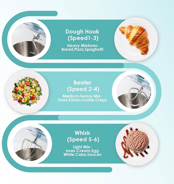 - 6 Speed, Easy to Use: This kitchen mixer features six adjustable speed settings and easy operation to meet your diverse mixing needs. The tilt-head feature allows for effortless switching between bowls and attachments.Its intuitive design ensures ease of use, making it ideal for both beginners and experienced bakers, delivering reliable performance for baking tasks.