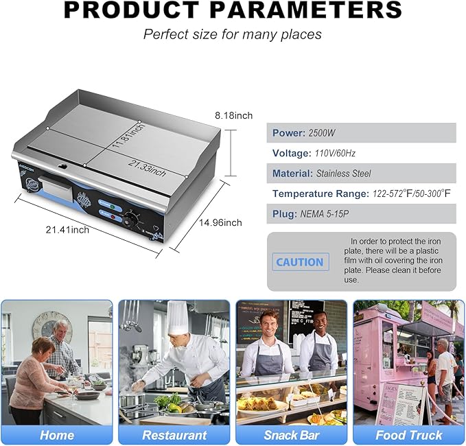 - Wide Compatibility - This electric grill is suitable for home use or commercial use in kitchens, restaurants, roadside stands, snack bars, etc.; whether you want to cook fried steak, pancakes, bacon, eggs, or other food, this grill can satisfy you.