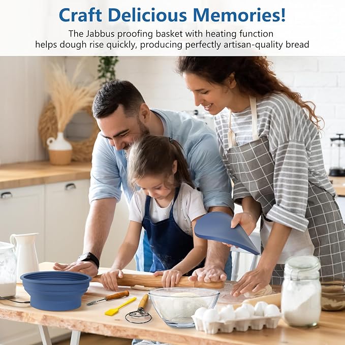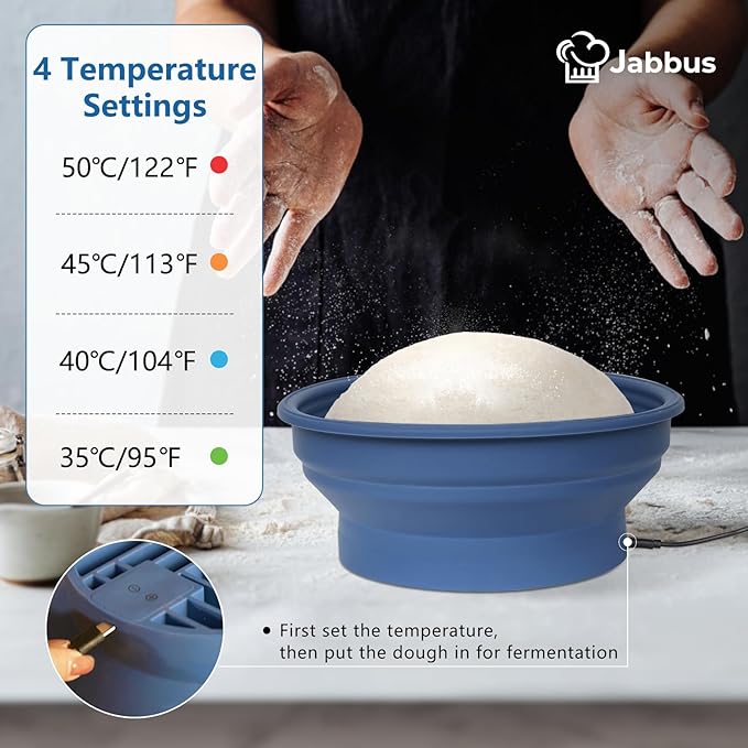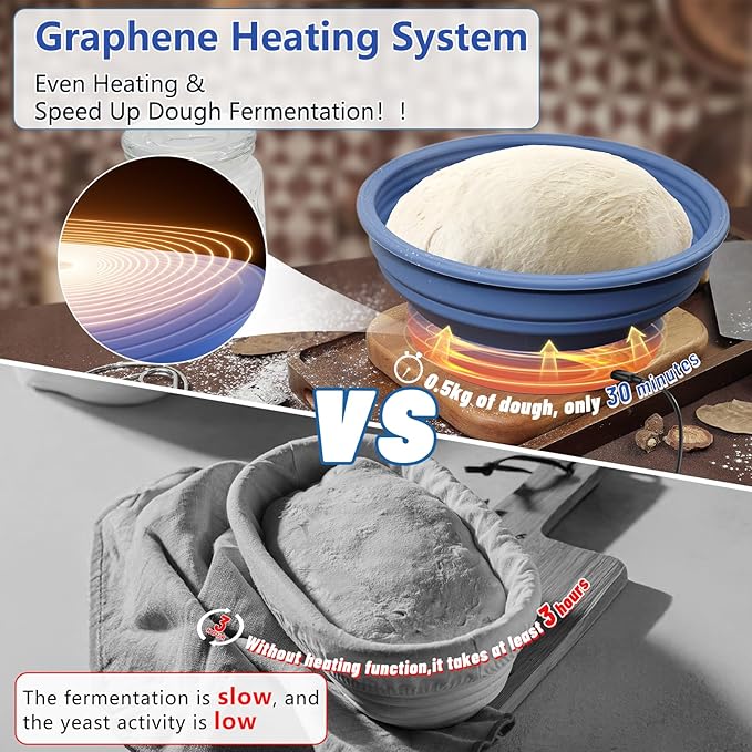 - Graphene Heating System: The graphene heat transfer system quickly provides heat to the bread proofing basket, allowing it to speed up fermentation. Compared to traditional Banneton proofing baskets, the jabbus silicone batter bowl reduces fermentation time, giving you a whole new baking experience. Even in the coldest winter, fermentation can be completed in just 30-60 minutes. No more waiting around—speed up your dough's rise!
