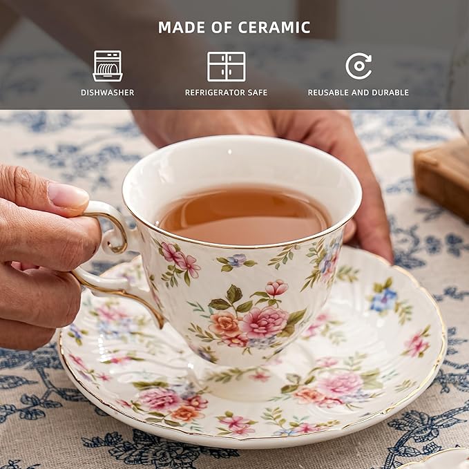 tea cups and saucers ceramic coffee mug 6oz for Coffee, Latte, Cafe Mocha and Tea-Set of 4, white with flowers