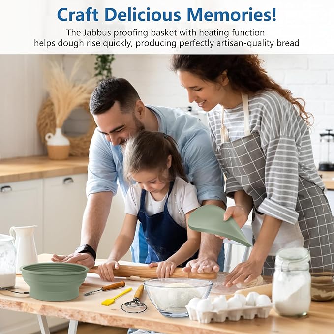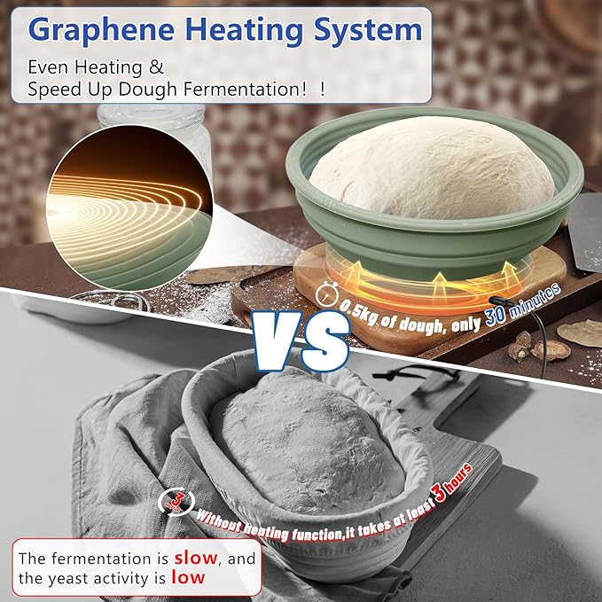 - Graphene Heating System: The graphene heat transfer system quickly provides heat to the bread proofing basket, allowing it to speed up fermentation. Compared to traditional Banneton proofing baskets, the jabbus silicone batter bowl reduces fermentation time, giving you a whole new baking experience. Even in the coldest winter, fermentation can be completed in just 30-60 minutes. No more waiting around—speed up your dough's rise!