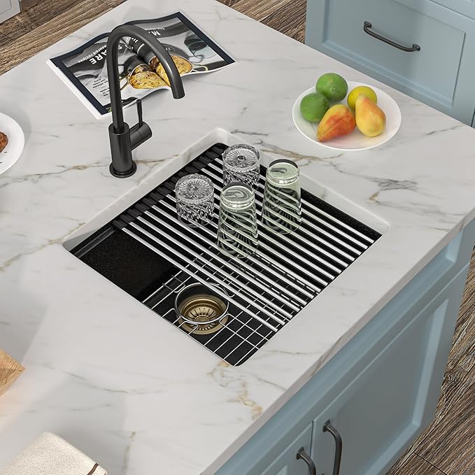 - Package/Fulorni Service ––Complete package includes a 18 inch single bowl granite composite undermount bar prep sink workstation, a solid wood cutting board, roll up drying rack, a bottom rinse grid, a gold drain assembly with cover, etc.|If any concerns and questions about the 18" black bar sink, pls get in touch with us, Fulorni service team is always ready to help you.