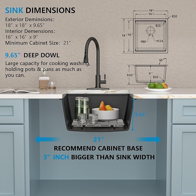 - Sink Size/Installation ––Exterior Dimensions: 18"(width) x 18"(depth) x 9.65"(height) | Interior Bowl: 16"W x 16"D x 9"H. Standard 3-1/2" drain opening fits any garbage disposal.|Cutout Size: 16"(Width) x 16"(Depth)|Minimum Cabinet Size: 21 Inch. Undermount/Under Counter installation creates a seamless transition from countertop to sink with no exposed edges for a more compact, stylish look.