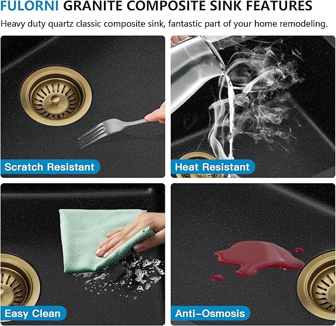 - Noise Defend/Fast Drainage ––Unlike normal stainless steel sink, thick composite construction of the granite quartz sink is naturally sound deadening, effectively eliminating vibrations, the sharp sound of running water and makes it quieter to use. Smooth, tightly sink finish is less likely to retain water stains, slightly sloped bottom allows the small quartz bar sink to drain quickly.