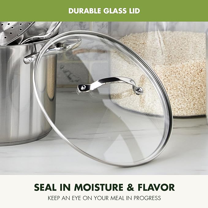 - COOK AND LOOK GLASS LIDS: Tempered glass lids lock in moisture while letting you monitor your cooking without lifting the lid.