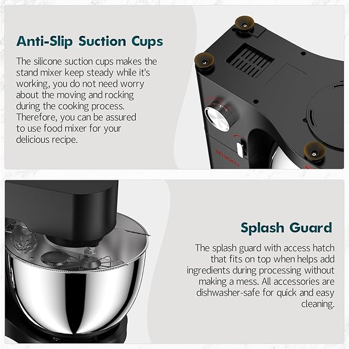 - 9.5-QUART HIGH CAPACITY - Large stainless steel mixing bowl offers enough capacity. Each COOKLEE kitchen Electric mixer comes with a dough hook, flat beater, wire whip, and pouring shield avoiding mess kneading process.