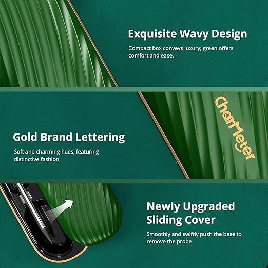 - ๐ ๐๐ฌ๐ก๐ข๐จ๐ง๐๐๐ฅ๐ ๐๐ข๐ ๐ก-๐๐ง๐ ๐๐ซ๐๐๐ง ๐๐๐ฌ๐ข๐ ๐ง: this portable wireless meat thermometer's base features green accents,with a flowing wave design reminiscent of a vibrant green prairie swaying in a gentle breeze.The flexible sliding cover,combined with the brand's gold logo and black temperature handle,not only exudes a sleek feel but also creates a unique,exclusive kitchen temperament.When you hold this cool green food thermometer while barbecuing with your neighbors or having dinner with your family, you will be the most eye-catching presence,and I can't wait to see you show off your culinary skills!