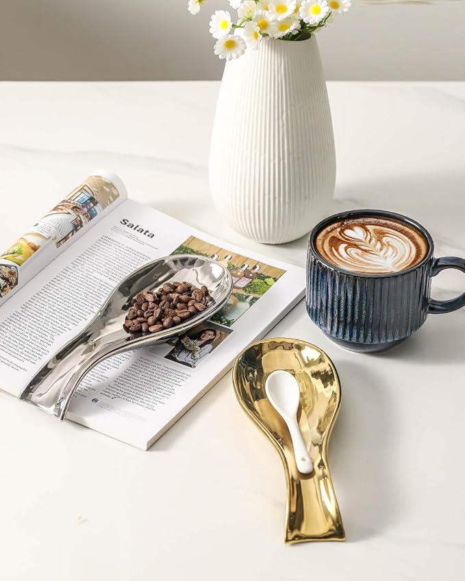 - VINTAGE AND PRACTICAL DESIGN: The gold and silver spoon rest looks so cute and elegant. It is stylish and nice, which adds luster to your kitchen decor. The spoon holder is the perfect decor for kitchen counter, stove top, dining table and coffee bar.