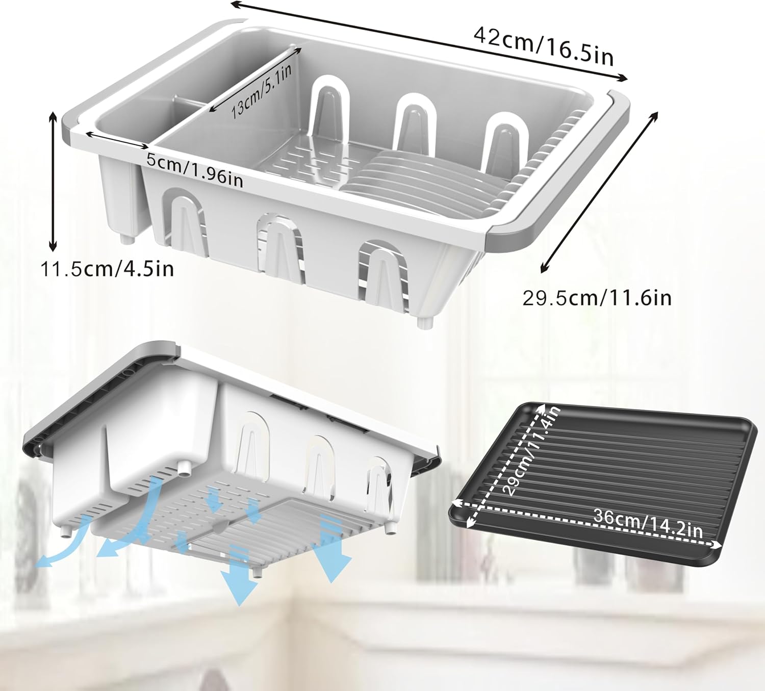 - [Heavy Duty Dish Drainer] Durable and sturdy plastic material preventing this dish drainer from rusting and can prolong its service life. The overall dimensions are 16.3”-20.3’’L x 11.6”W x 4.3”H, with extendable handles (16.3" to 20.3") to fit in most kitchen sinks. this dish drainer No need assembly and No tool needed.